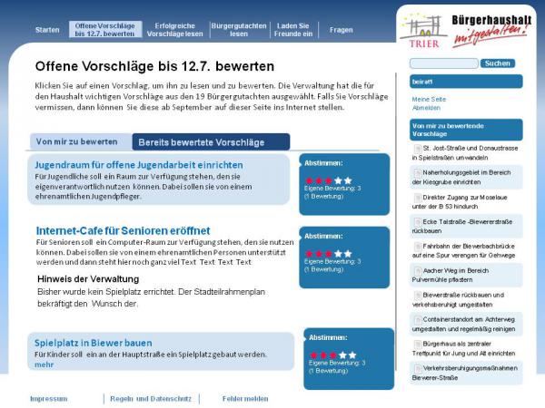 Die erste Online-Phase zum Trierer Bürgerhaushalt wurde erfolgreich abgeschlossen. Die Top fünf bis sieben (bei Punktegleichheit) sind gekürt. 856 Personen hatten sich in vier Wochen an der Beteiligungsplattform registriert und 17.193 Bewertungen vorgenommen. Auf Anhieb haben sich in wenigen Wochen ebenso viele Personen beteiligt wie zuvor an der Erstellung der Bürgergutachten beteiligt waren.