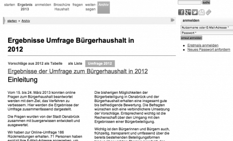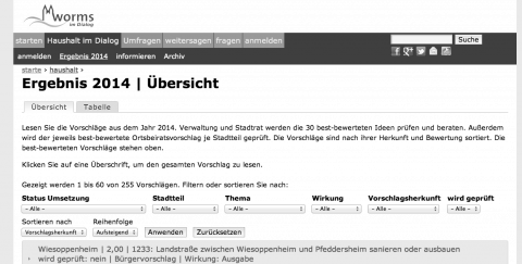 Vom 07.11.2013 bis zum 24.11.2013 konnten die Bürgerinnen und Bürger Wesels an der Haushaltsplanung für die Folgejahre mitwirken. Es konnten schriftlich sowie im Rahmen eines von buergerwissen konzipierten Online-Dialogs Ideen geäußert und Vorschläge eingereicht werden.