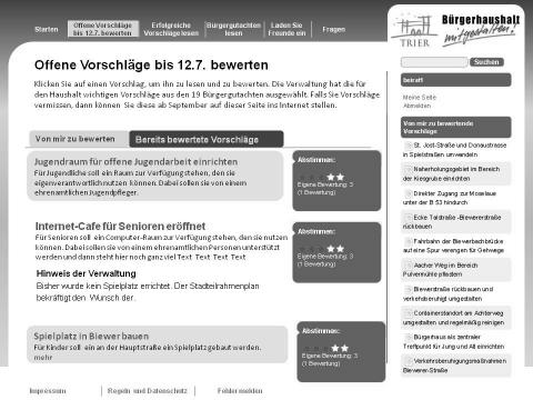 Die 2. Online-Phase zum Bürgerhaushalt Trier startet am 23. September 2009. Stadtvorstand, Beirat und der Steuerungsausschuss der Verwaltung berieten in der vergangenen Woche letzte Details des Konzepts. Bis zum 14. Oktober können Vorschläge ergänzt, kommentiert und bis zum 20. Oktober bewertet werden. Einmalig ist, dass die Ratsfraktionen die bestbewerteten Bürgervorschläge online kommentieren werden. Die Verwaltung wird die Ratsvorlagen mit Hilfe der Beteiligungsplattform erstellen. ...mehr about Bürgerhaushalt Trier: 2. Phase startet am 23. September